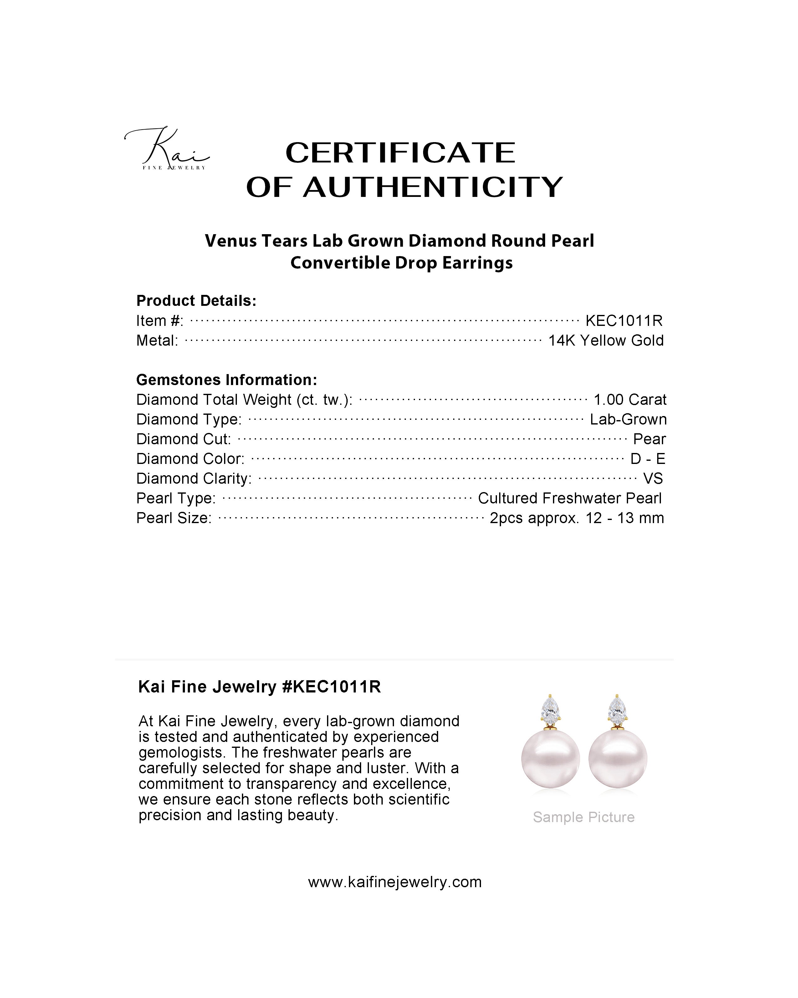 Venus Tears Lab Grown Diamond 12-13mm Cultured Round Pearl Convertible Drop Earrings 14k yellow gold