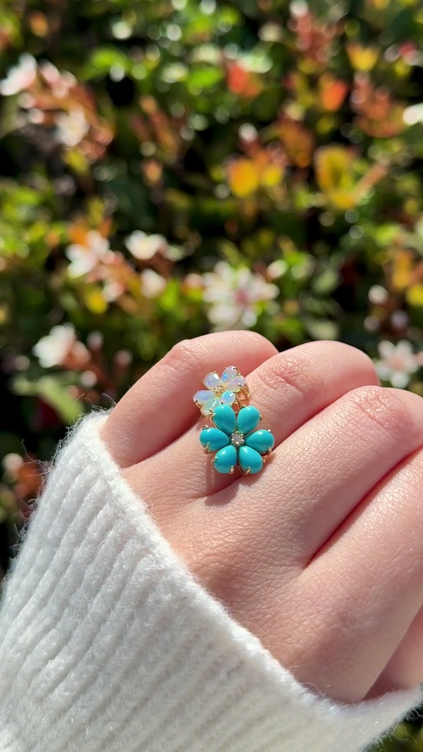 This ring is beautiful. The opal was sparkling and the turquoise was striking in a vibrant blue color. The ring also came in a beautiful presentation box. The seller was wonderful and very accommodating to my request. I can't recommend her shop enough!