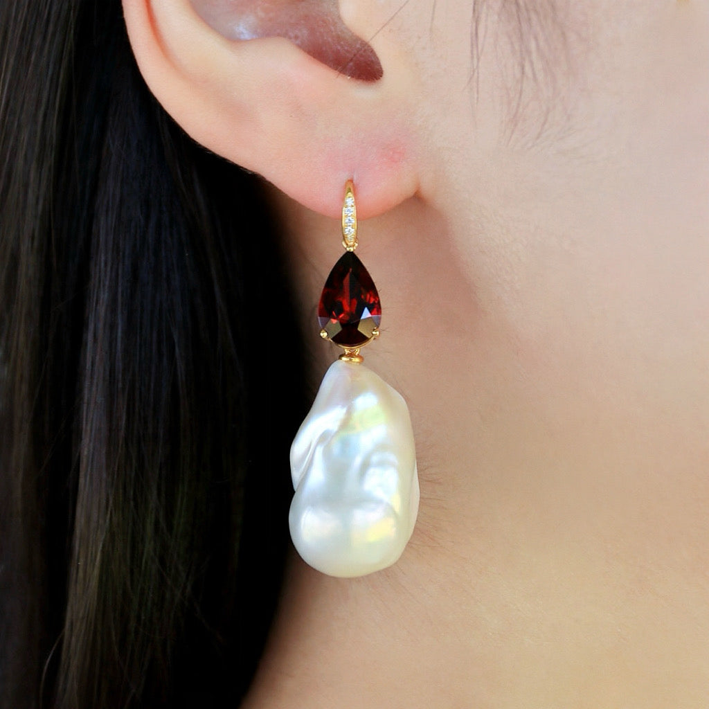 Radiant Pear Garnet Diamond Baroque Pearl Convertible Drop Earrings